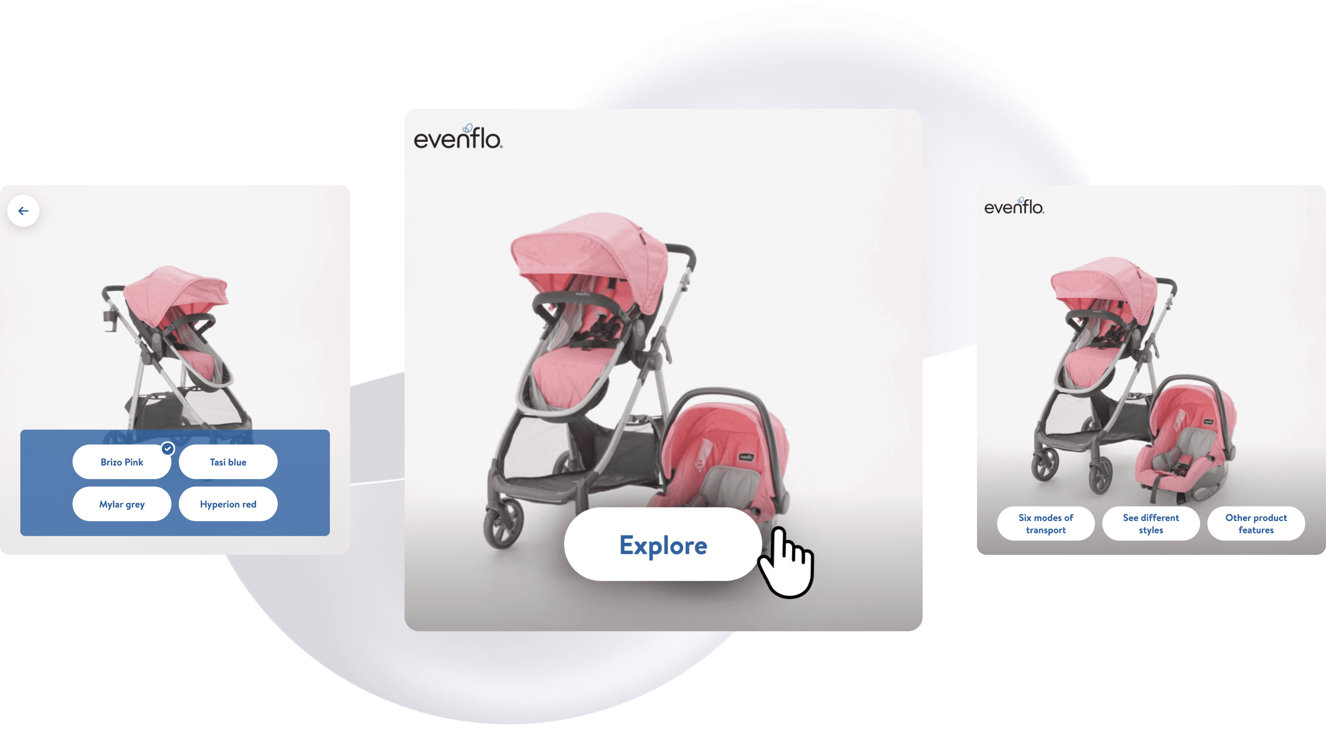 Check out Evenflo's stroller below—customers can thoroughly explore transportation modes, different styles, folding mechanisms, and storage capacity.