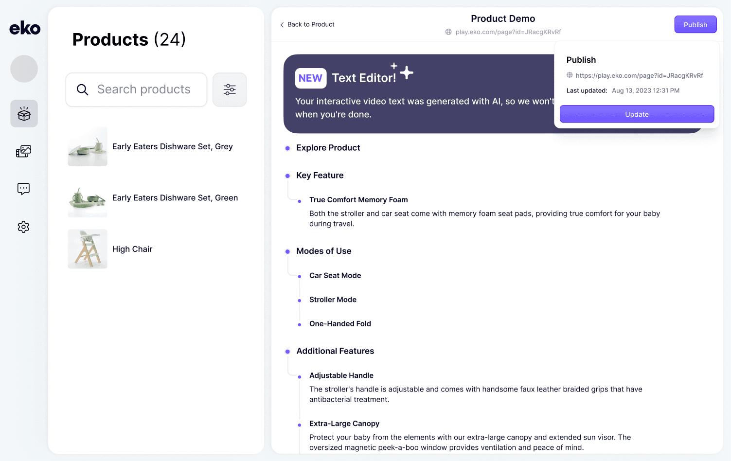 Manage, customize, and create—all in one place. Eko’s Dashboard is your hub for organizing digital assets, whether created by Eko or imported from other sources. Our AI-powered tools make it easy to manage interactive video experiences, enhance and customize product visuals, and share them effortlessly across your digital channels. With Eko, you’re in control of how customers explore and connect with your products.